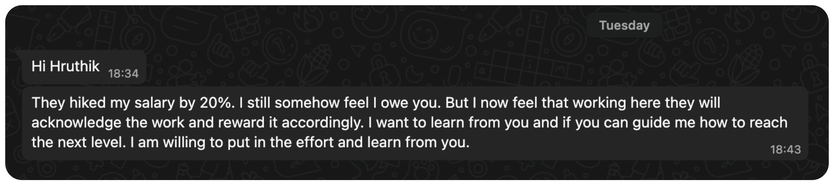 I consider myself an above-average developer, but an even better educator. Education is where I want to make an impact, and Frontend Hire is one of the ways. Also, one of the recent message from someone I mentored a while ago.