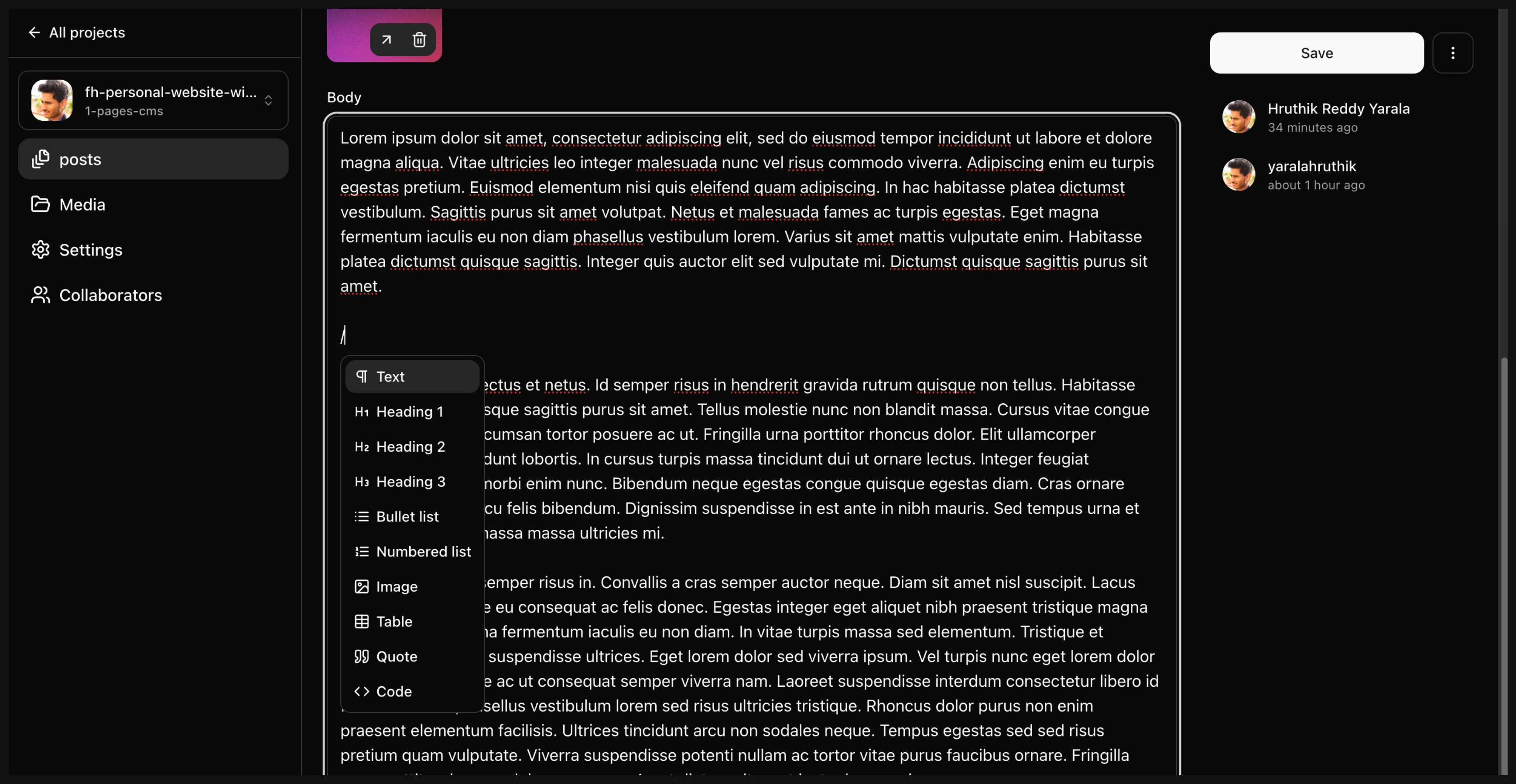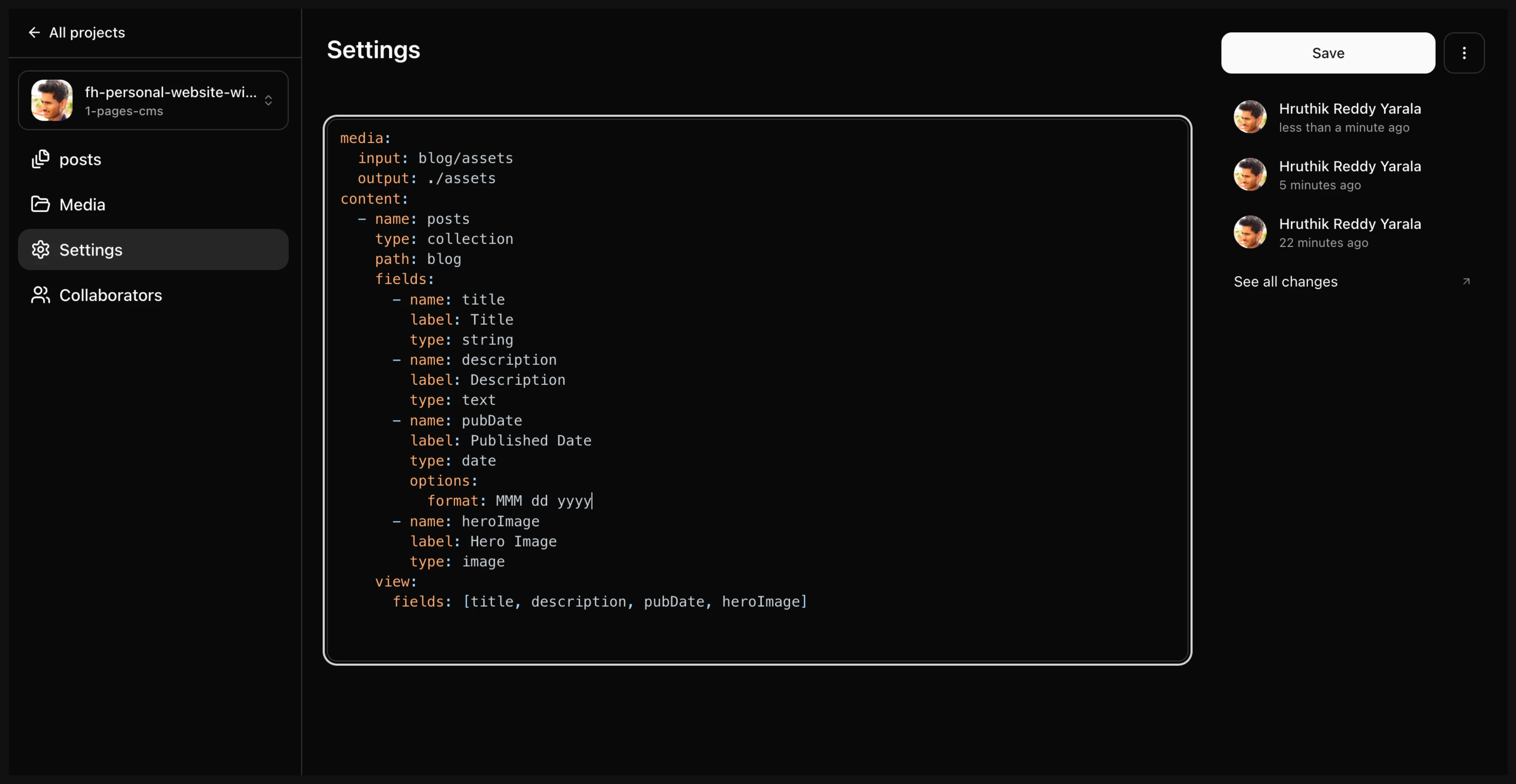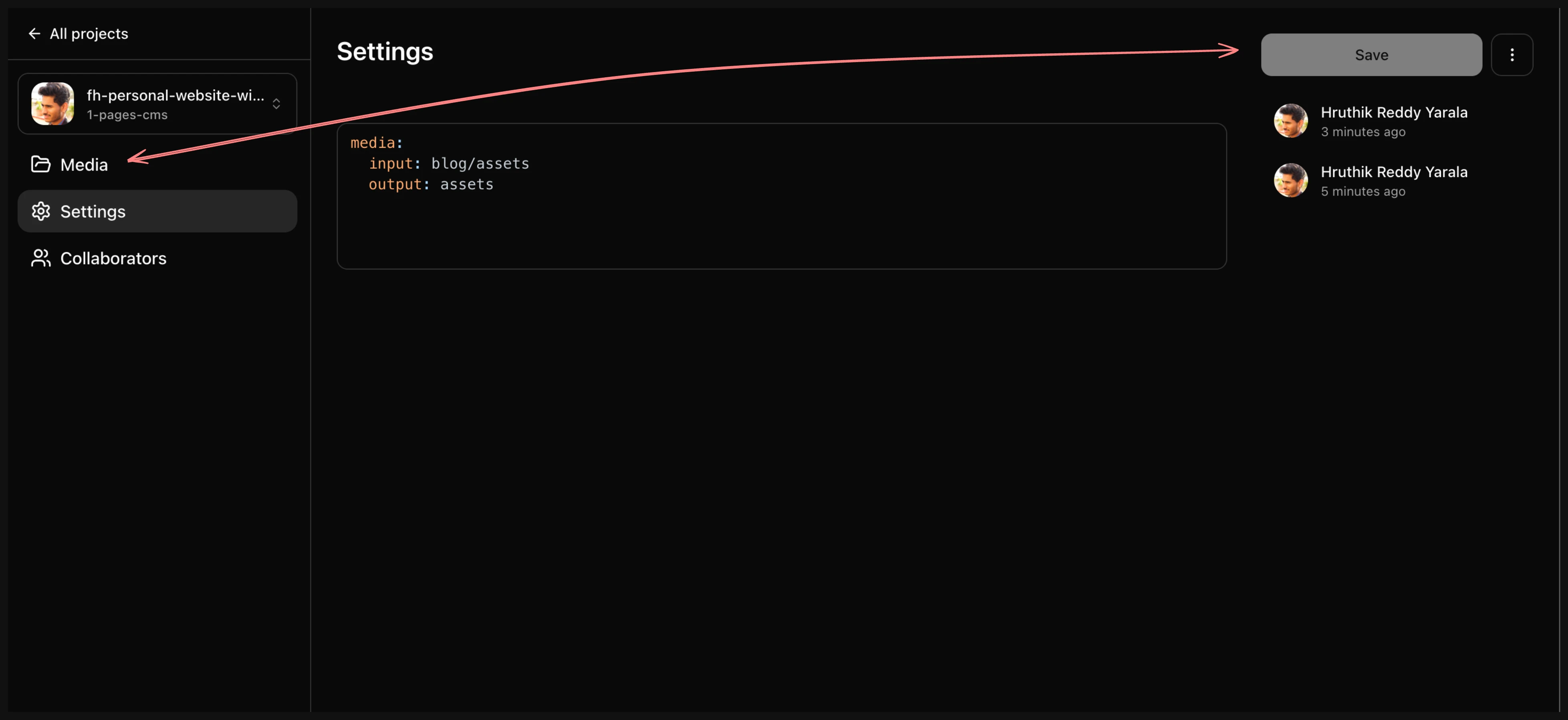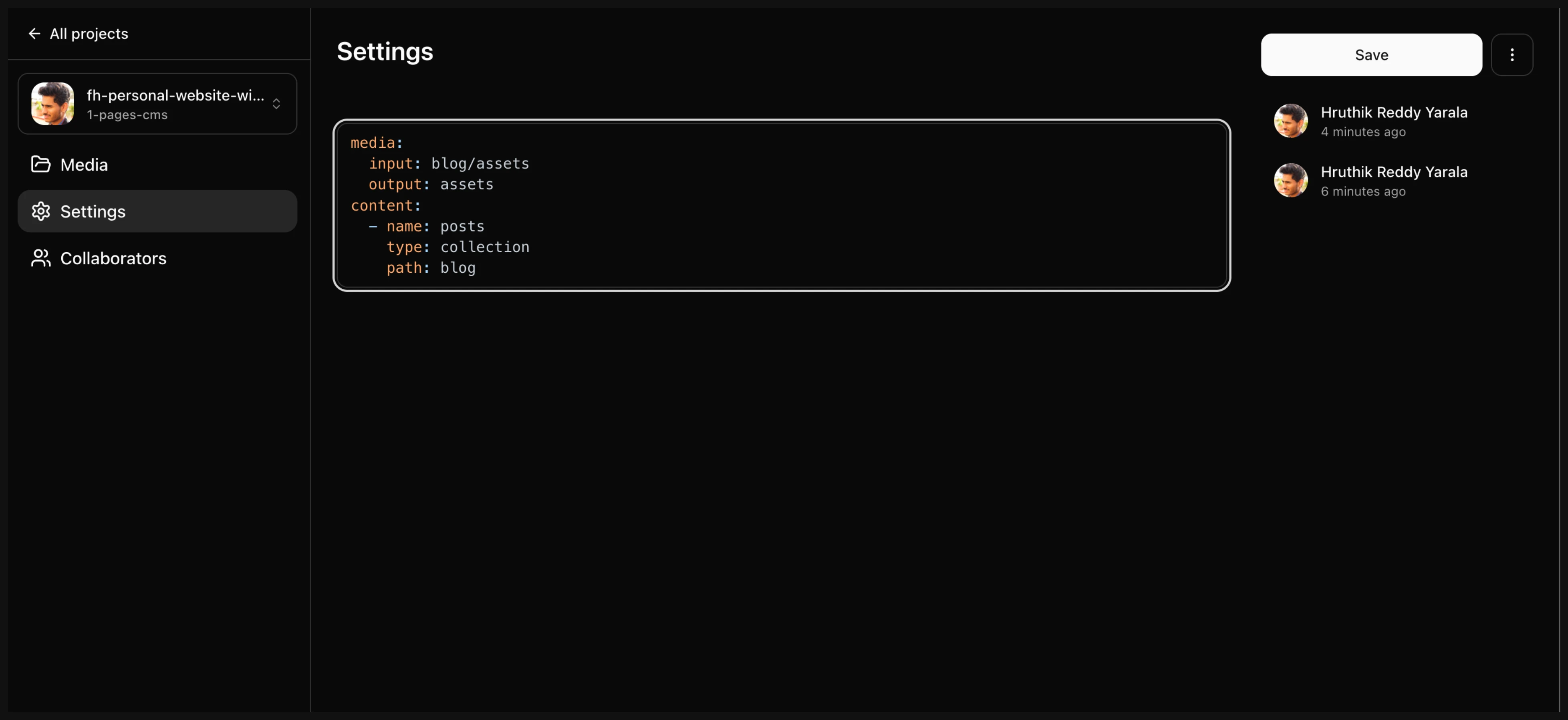 Pages CMS commits changes When they hit save, Pages CMS creates a commit in your GitHub repository—just like a developer would.