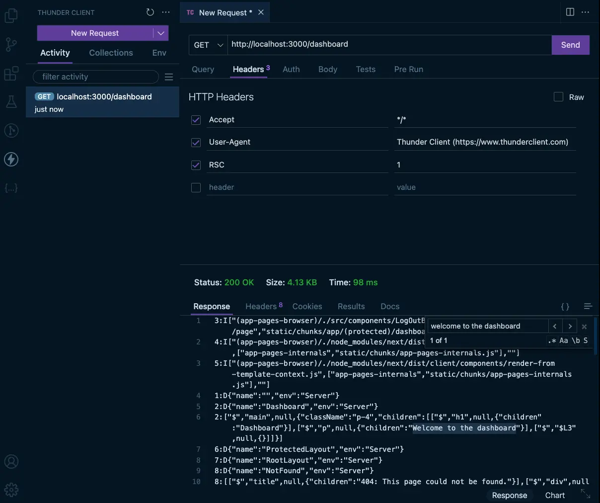 But how secure is this in reality? Let us make a GET request to the page with a special header called RSC set to 1 and make a request to the endpoint http://localhost:3000/dashboard and check the response for the text Welcome to the dashboard. If this was secure, we would not be able to see that text.